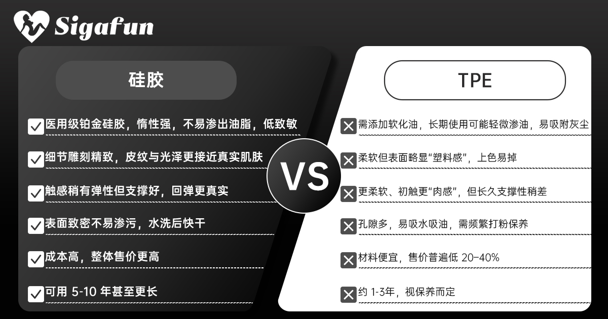 Uncategorized 终极指南 | 硅胶与TPE:我该选择哪个? 19 9 月, 2025 发布者 Sigafun娃娃 19 9 月 在购买真人尺寸或半身性爱玩具时,最常见的疑问之一就是:硅胶和TPE材质到底该选哪一种?这篇内容将从安全性、视觉效果、使用感、清洁难易度、价格与持久度等方面,带你一次看懂两种材质的差别,帮你做出最适合的选择。 Sigafun 硅胶娃娃 目录 一、关键指标对比 二、为什么顾客不再复购 TPE?虽然 TPE 初次购买时价格诱人,但许多用户在真实使用后,往往不会再次选择,主要原因包括:1、渗油与异味:软化油会逐渐渗出,带来粘腻手感与淡淡塑料味;2、色料晕染:娃娃的身体色料会随着软化油晕染,出现色块斑驳。3、清洁繁琐:孔隙结构易吸附灰尘与液体,需要频繁打粉和彻底风干,不然容易滋生霉菌和细菌。4、耐久度不足:使用 1–2 年后弹性和色泽明显下降,皮肤易裂。5、二次投资成本高:综合维护与替换频率,长期支出并不比硅胶省。 三、为什么很多人升级硅胶?1、安全健康:医用级铂金硅胶不含有害增塑剂,安全无味。2、视觉与触感升级:硅胶的皮肤纹理细节、色泽逼真度远超 TPE,不论是使用体验,还是拍照展示,硅胶都是高级性爱娃娃的首选材料。3、长期投资:一次投入,可陪伴多年。4、加热与智能玩法:硅胶结构稳定可承受- 60℃至 200℃的极端温度,可以使用加热棒进行体温模拟,未来还可植入加热芯片、互动传感,实现更真实的互动体验,比TPE更真实、可靠、安全。 四、 质感对比硅胶通道:内壁更细腻,纹理立体且耐用,长时间使用仍保持弹性。TPE通道:初触柔软,但频繁使用后结构容易松弛,需要更细心的干燥和打粉。 tpe 和硅胶,各有所长,并不是所有人都必须买硅胶。如果你的预算有限,是首次尝试入手,喜欢柔软触感,并愿意勤快保养;对长期耐久度要求不高,TPE 是性价比不错的选择。如果你追求触感的真实度与视觉的高保真,对健康卫生和低过敏性有更高要求,希望免去频繁保养的麻烦;计划长期高频使用,并想尝试智能加热、定制化妆等高级玩法。硅胶绝对值得一次到位的投资。 总结来说: TPE 适合“尝鲜”,硅胶适合“长久拥有”。这也是许多玩家最终从TPE 升级到硅胶的根本原因。当然,无论选择哪种材质,选择有口碑的正规厂家与品牌,才是体验与安全的根本保障。 Sigafun 致力于打造真实、精致、令人惊艳的高端仿真硅胶娃娃产品。品牌专注于硅胶材质,追求极致还原,让每一位用户都能感受到真实触感与视觉细节的双重体验,Sigafun坚信,情趣产品不仅仅是满足欲望的工具,更是用户探索感官、释放情绪、体验真实的一种方式。Sigafun是全网首家提供终身免费维修服务的硅胶娃娃品牌,一切只为更好、更安全的用户体验。